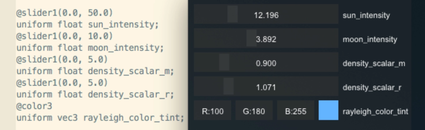 To facilitate prototyping and shader tweaks, it is possible to generate GUI controls with shader annotations:
